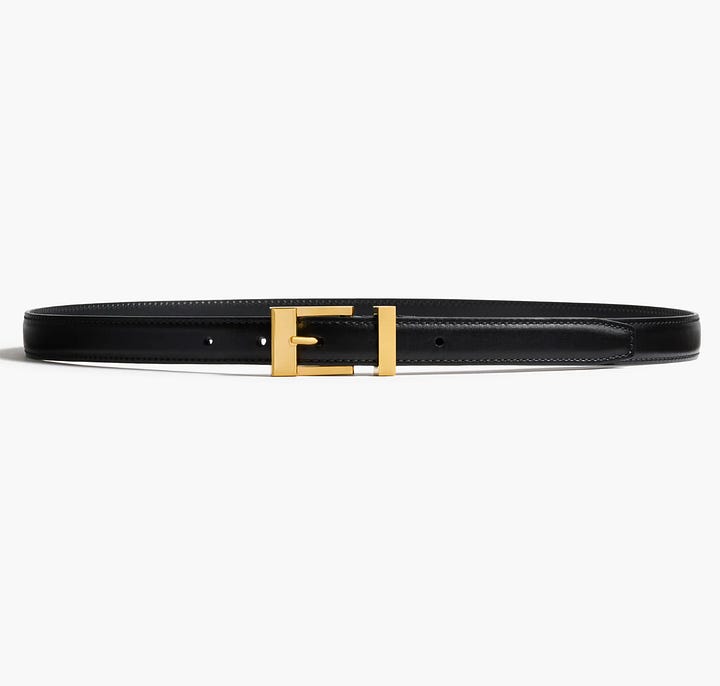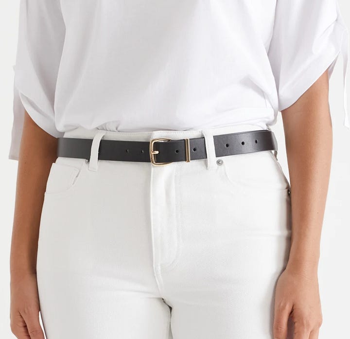 Clockwise L-R: Leigh’s boujie: Fuchsia Shaw The Arden Coat, $479, and budget: Sussan Everyday Leather Belt, $39.95. Sam’s boujie: Khaite leather belts, prices vary, and budget: Assembly Label Waverly Jacket, $180.